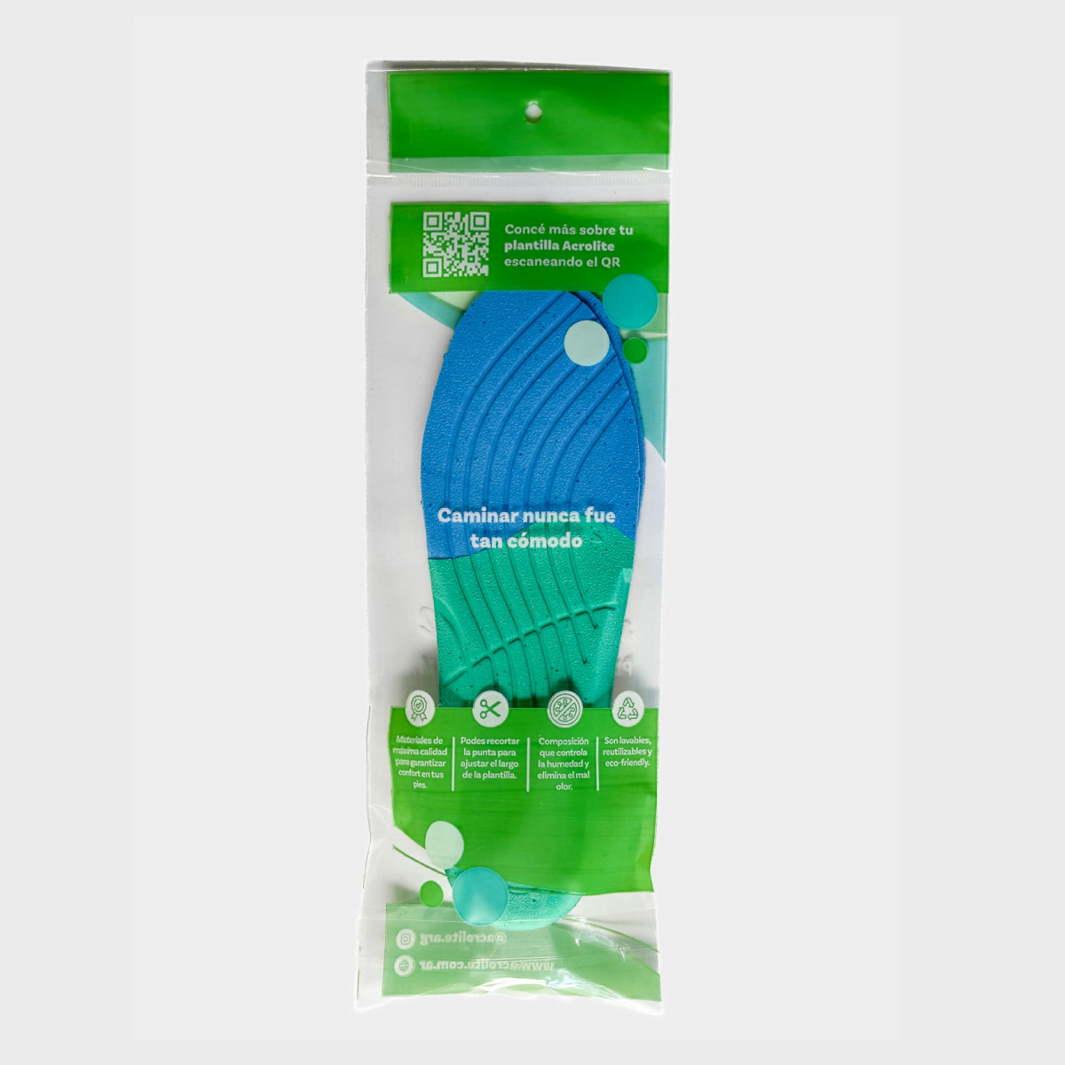 Fabricada con espuma de alta densidad Acrolite® (97 kg/m³) y un 5% de material reciclado, esta plantilla cuida el medio ambiente sin resignar calidad. Su dureza C 22-23 ofrece el balance ideal entre suavidad y estabilidad, mientras que su alta elasticidad y recuperación inmediata evitan deformaciones incluso tras un uso intensivo. Resistente al esfuerzo, soporta tracción y desgarro para una mayor durabilidad. Además, sus propiedades antimicrobianas mantienen el pie fresco e higiénico, y su diseño bicolor en verde y celeste refuerza su identidad tecnológica y sustentable.